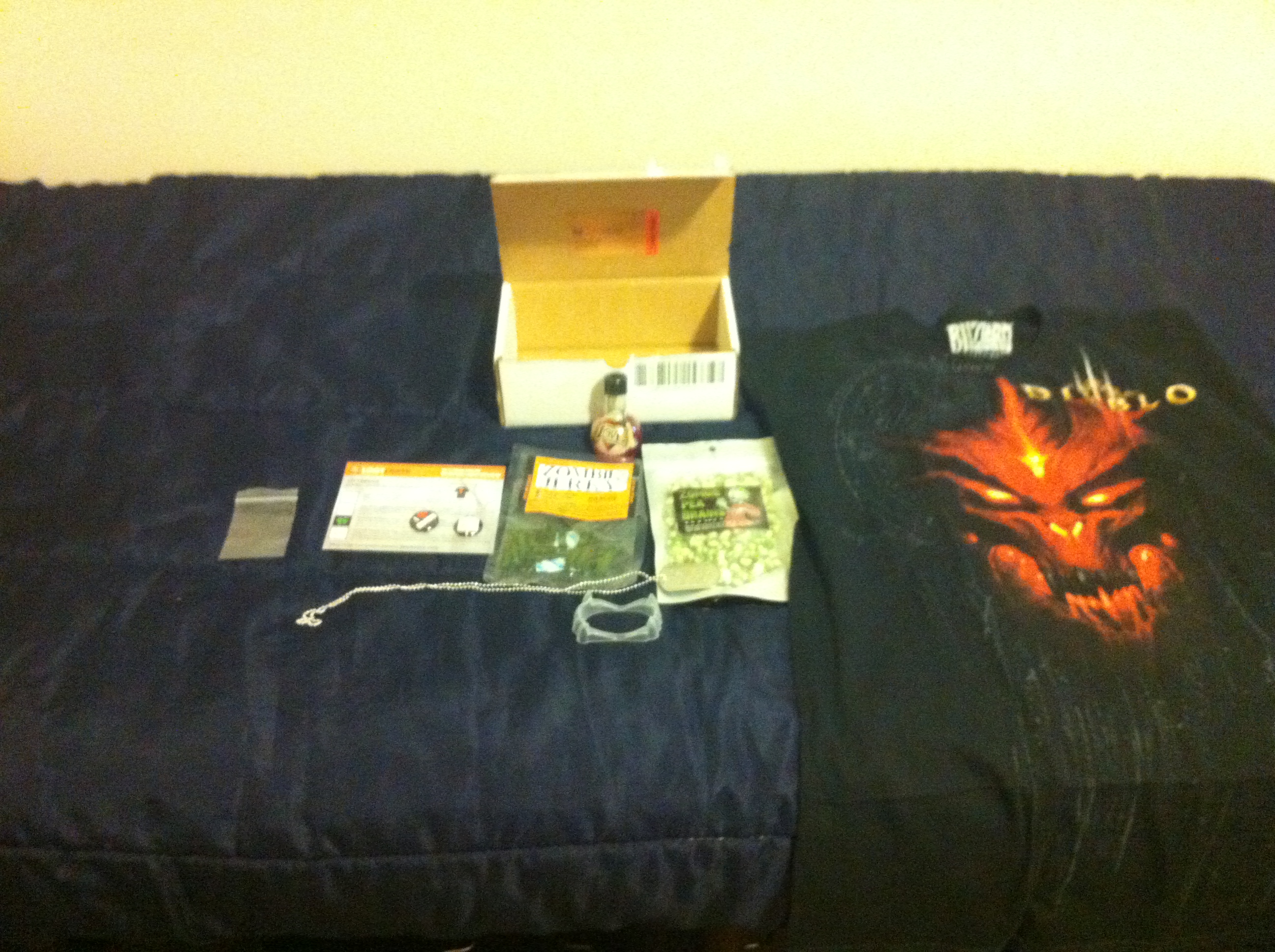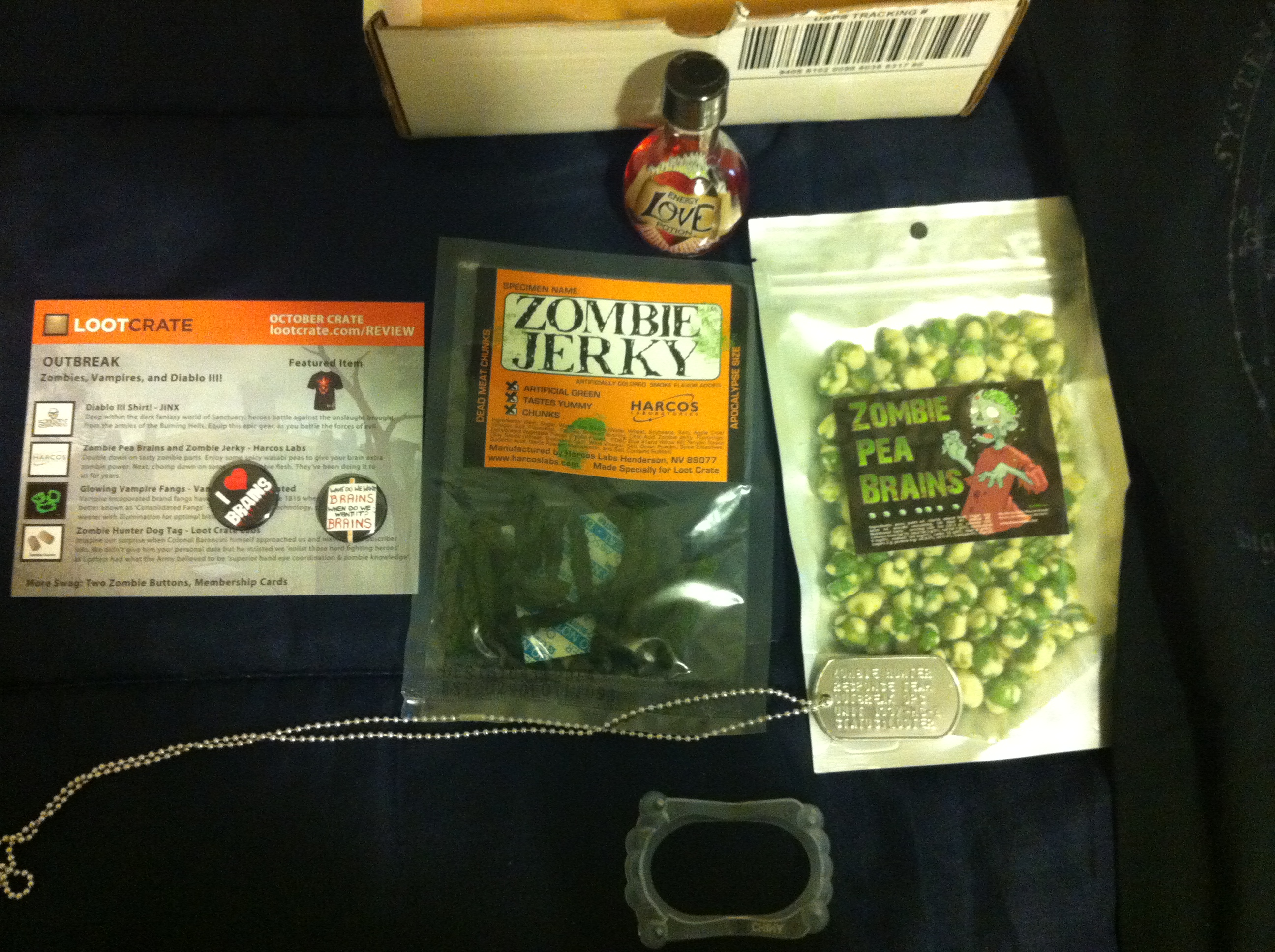 This month’s Halloween themed LootCrate included a nice Diablo III shirt, zombie jerky, zombie ‘pea brains’, a zombie hunter dog tag, a ‘health / love potion’, vampire teeth, some zombie buttons and a membership card (don’t believe I’m forgetting anything).