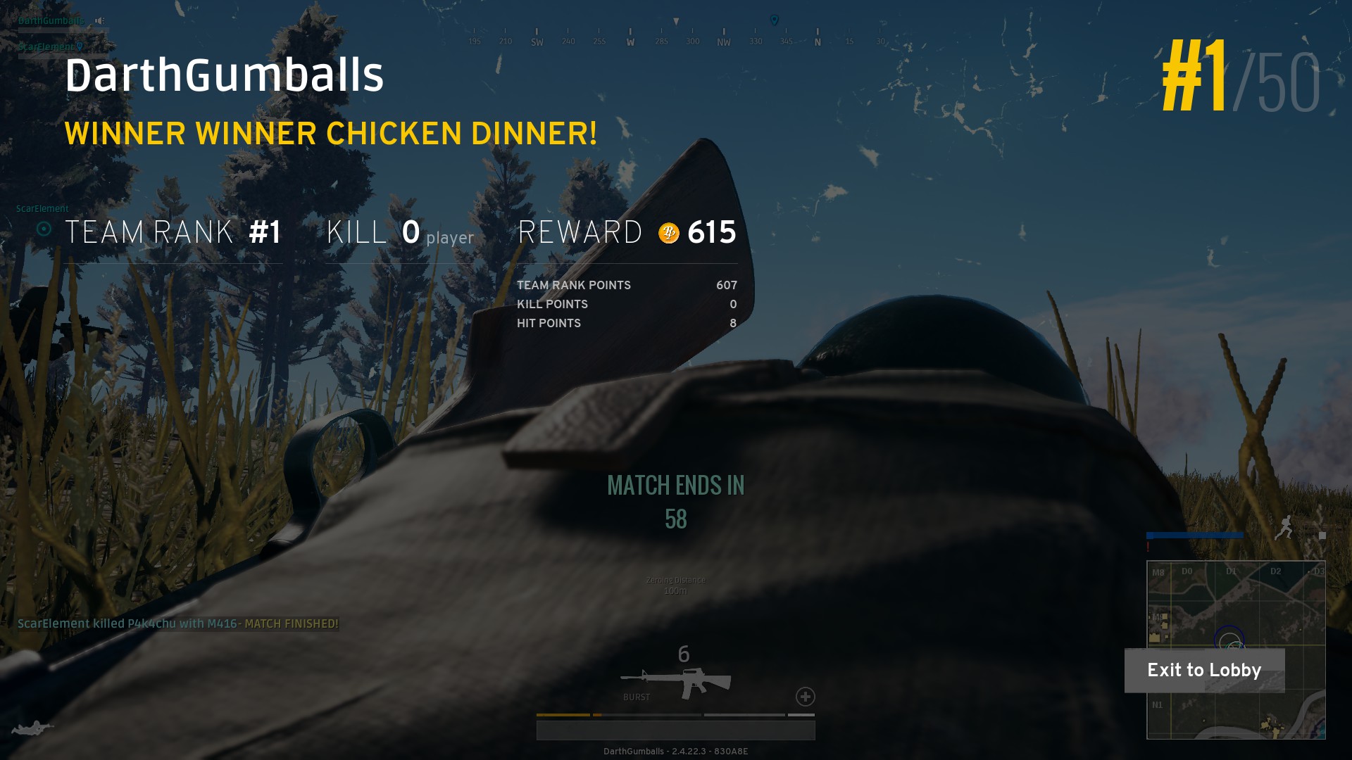This turned out to by my best solo game yet, as the circle closed in on a wide open area and everyone had to abandon their buildings and work toward it. I stayed silent in the grass by the trees and watched as everyone started picking each other off. I could hear bullets whizzing over my head, but I resisted the urge to get up and just waited. Before long I caught a glimpse of someone working their way toward me, but they hadn’t seen me yet. I decided I needed to take action, and tried taking them out, but the sound of gunfire attracted more eyes and we were both put down by someone else. I finished 7th, in one of the most excited games I’ve played yet.