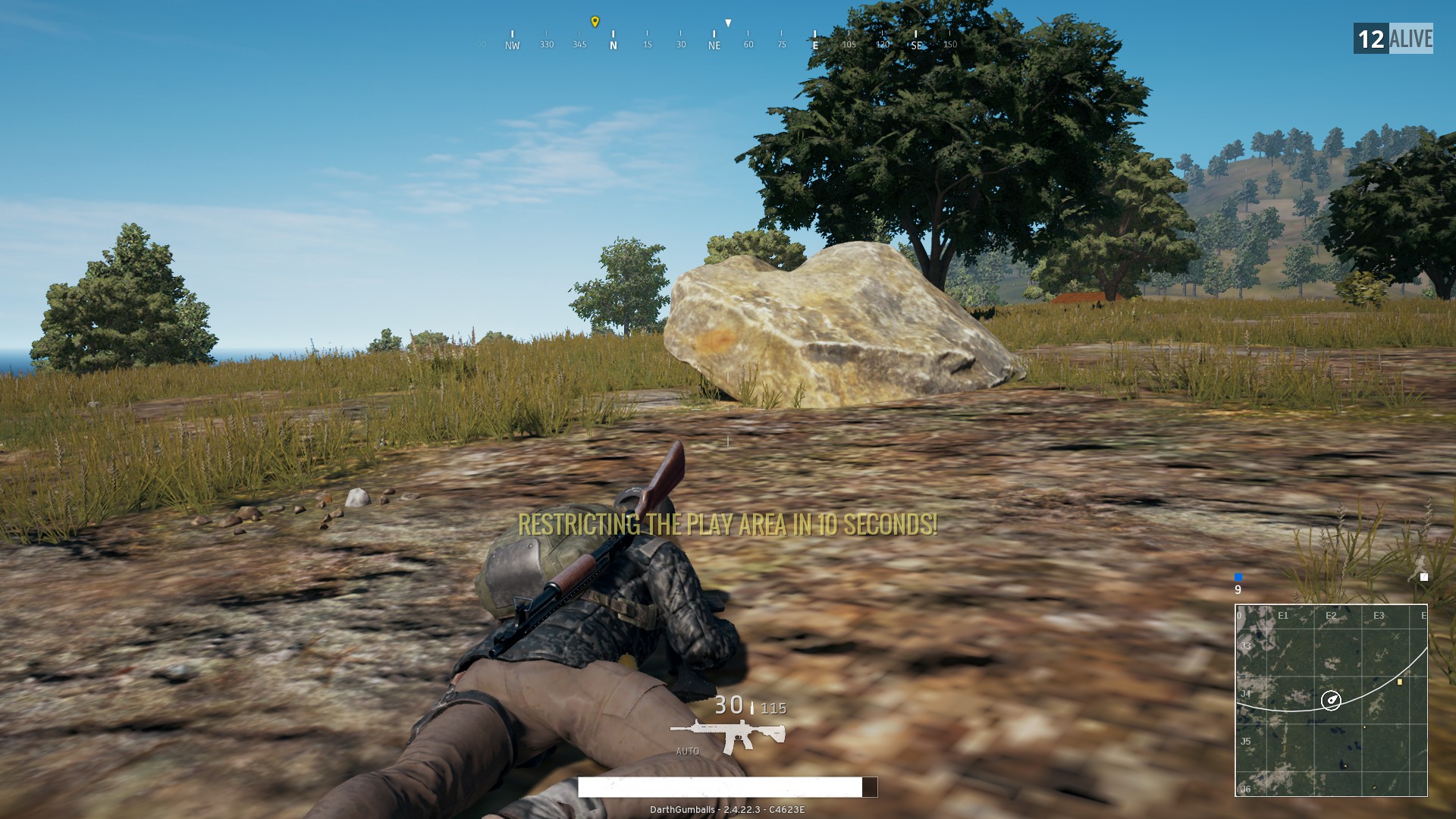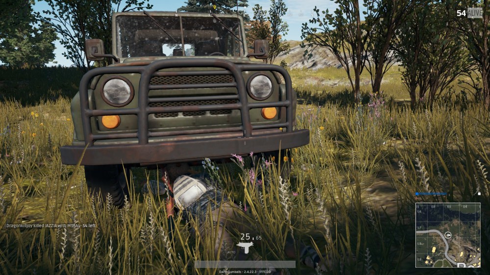 In another game last night I found ideal cover by driving a vehicle up against a cliff and hiding prone underneath it. My backside was covered and I felt relatively safe despite being out in the open. I’ve found I actually tend to survive longer if I’m crawling in the grass than I do if I’m hiding in a building, I assume because most people gravitate toward solid cover and ignore the open grass. Unfortunately, this optimal cover didn’t last as I soon had to make the trek inward again. I eventually ditched the vehicle by a rock and began crawling slowly and carefully as I ended up well within the circle with plenty of tree and rock cover.