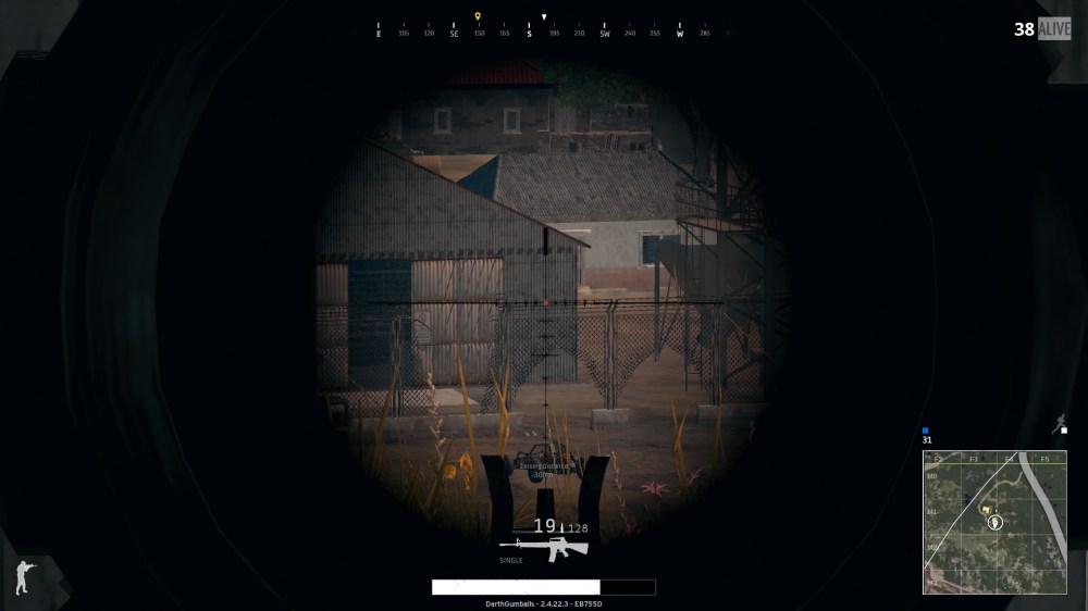 Last night I was playing solo and someone ran up into my building without knowing I was there. I was able to take them out with an uzi and found an 8X scope on their body, the first time I’ve come across such a high powered scope in the game. I affixed it on my M16 and watched over the city below me. It wasn’t long before I saw two people engage in a firefight, and it was an awesome feeling to take out one of them from afar. The other player ducked back inside that building, unfortunately, and never poked their head back out. I decided to continue keeping watch over the city, as I had seen two other people walking around it, however this contributed to my downfall as I was shotgunned in the face while looking down the scope five minutes later.