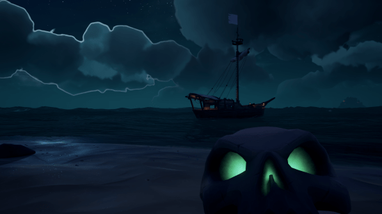 Sea of Thieves isn’t always lighthearted fun. There have been plenty of tense moments as we approached a port only to spot the lantern light of a galleon in the distance. Did they spot us? We ask ourselves as we frantically run around the ship extinguishing all of our own lanterns before dropping the anchor and hoping the rough waves make us difficult to spot. We patiently wait, afraid to risk our bounty beneath deck by approaching the port while unknown players lurk about the island. Eventually they sail away and we creep in as dawn breaks and we unload our chests and skulls in exchange for gold and faction reputation.
